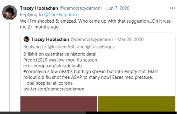 2.1.8(d)(iv) Unlike the exponential qualitative modellers, I believed it was possible to quantitatively model COVID19 using influenza as a benchmark with newspaper reports on prior years flu no.’s to gauge severity & it would be more accurate.  I believe it is possible to quantitatively model any disease to gauge threat levels using this method.